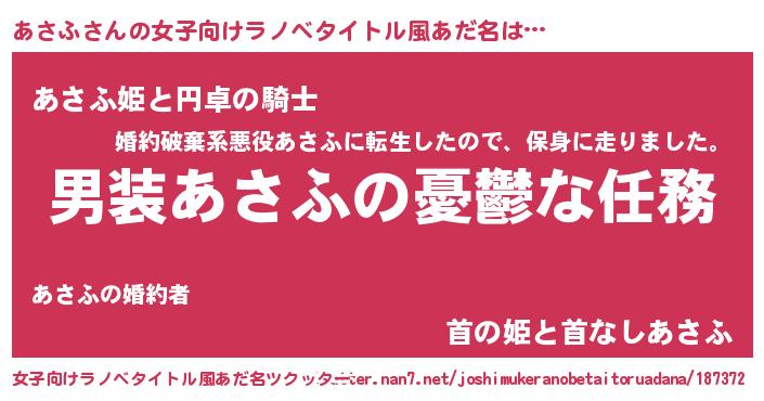 | 男性向けラノベタイトル風あだ名 | 『うちのあさふが世界を掌握している!』 |