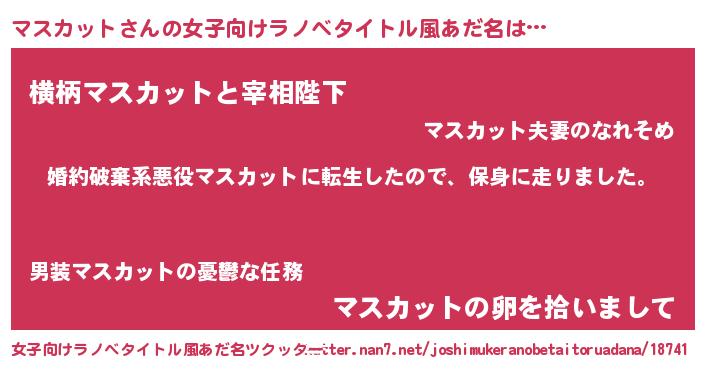 | 男性向けラノベタイトル風あだ名 | 『転生したらマスカットだった件』 |