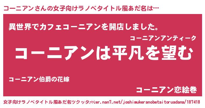 | 男性向けラノベタイトル風あだ名 | 『ダンジョンにコーニアンを求めるのは間違っているだろうか』 |