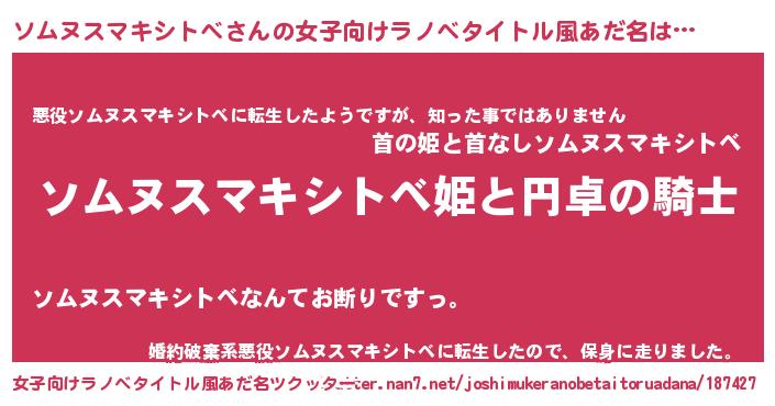 | 男性向けラノベタイトル風あだ名 | 『ソムヌスマキシトベアートオンライン』 |