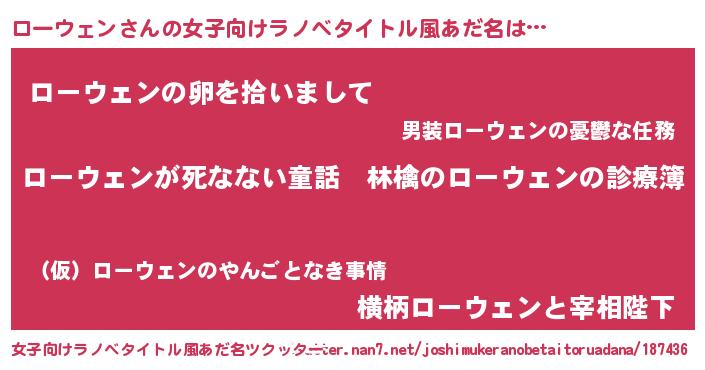 | 男性向けラノベタイトル風あだ名 | 『魔弾の王とローウェン』 |