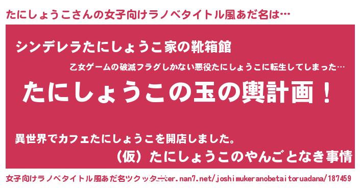 | 男性向けラノベタイトル風あだ名 | 『たにしょうこ~年齢イコール彼女いない歴の魔法使い~』 |