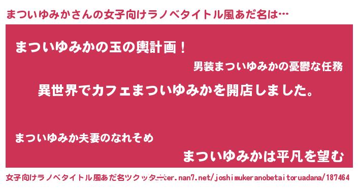 まついゆみかさんの女子向けラノベタイトル風あだ名は… 『異世界でカフェまついゆみかを開店しました。』『まついゆみかの玉の輿計画!』『まついゆみかは平凡を望む』 ツクッター #女子向けラノベタイトル風あだ名ツクッター http://tkutter.nan7.net/joshimukeranobetaitoruadana/187464/