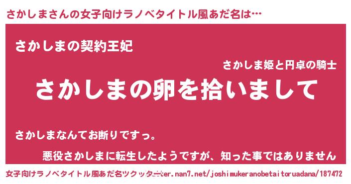 | 男性向けラノベタイトル風あだ名 | 『さかしまの嫁は女の子じゃないと思った?』 |