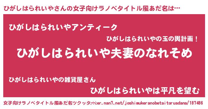 | 男性向けラノベタイトル風あだ名 | 『おまえをオタクにしてやるから、俺をひがしはられいやにしてくれ! 』 |