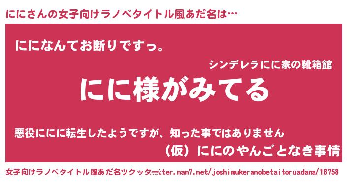 | 男性向けラノベタイトル風あだ名 | 『ににの嫁は女の子じゃないと思った?』 |