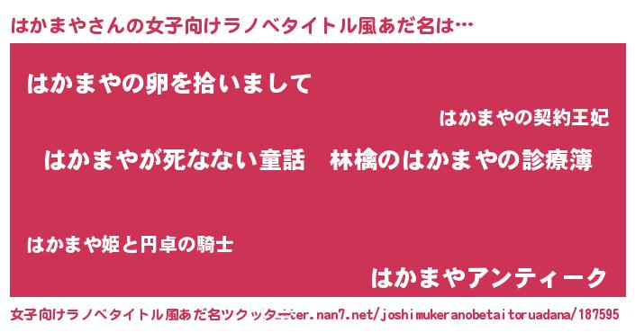 | 男性向けラノベタイトル風あだ名 | 『魔弾の王とはかまや』『はかまやの憂鬱』 |
