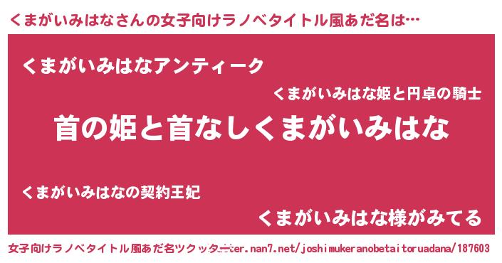 くまがいみはなさんの女子向けラノベタイトル風あだ名は… 『首の姫と首なしくまがいみはな』『くまがいみはなアンティーク』『くまがいみはな様がみてる』 ツクッター #女子向けラノベタイトル風あだ名ツクッター http://tkutter.nan7.net/joshimukeranobetaitoruadana/187603/