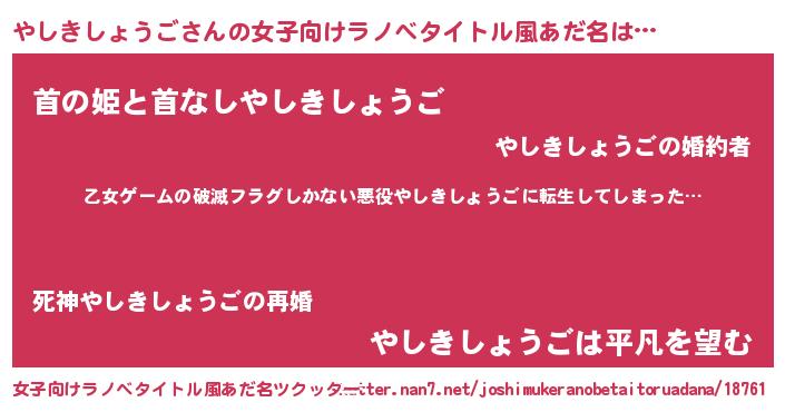 やしきしょうごさんの女子向けラノベタイトル風あだ名は… 『乙女ゲームの破滅フラグしかない悪役やしきしょうごに転生してしまった…』『首の姫と首なしやしきしょうご』『やしきしょうごは平凡を望む』 ツクッター #女子向けラノベタイトル風あだ名ツクッター http://tkutter.nan7.net/joshimukeranobetaitoruadana/18761/