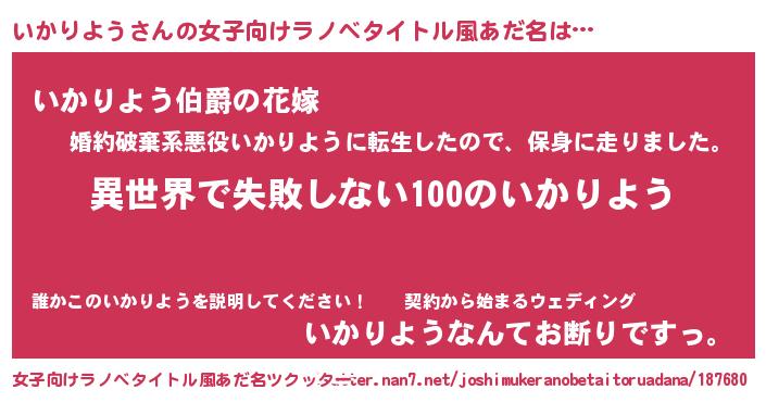 | 男性向けラノベタイトル風あだ名 | 『いかりようという概念が存在しない退屈な世界 』 |