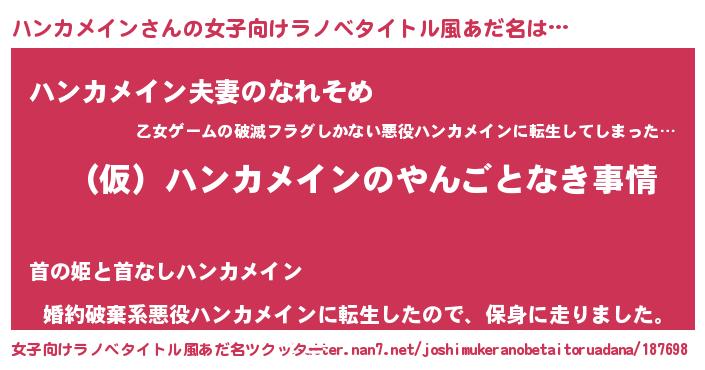 | 男性向けラノベタイトル風あだ名 | 『ハンカメインの憂鬱』 |