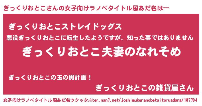 | 男性向けラノベタイトル風あだ名 | 『おまえをオタクにしてやるから、俺をぎっくりおとこにしてくれ! 』 |
