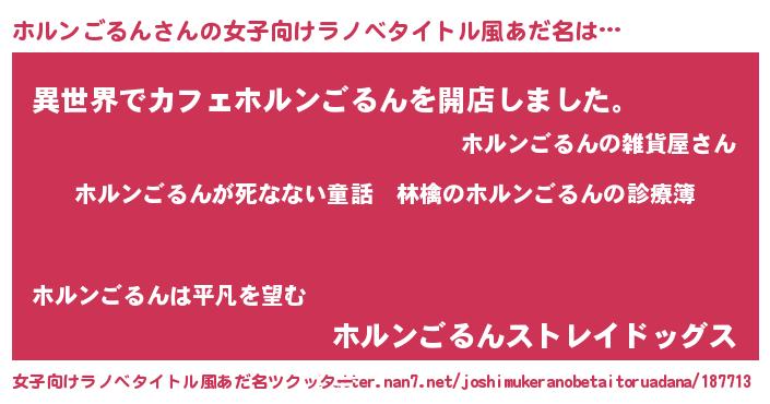 ホルンごるんさんの女子向けラノベタイトル風あだ名は… 『ホルンごるんが死なない童話 林檎のホルンごるんの診療簿』『異世界でカフェホルンごるんを開店しました。』『ホルンごるんストレイドッグス』 ツクッター #女子向けラノベタイトル風あだ名ツクッター http://tkutter.nan7.net/joshimukeranobetaitoruadana/187713/