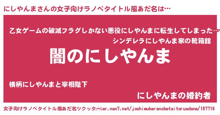 | 男性向けラノベタイトル風あだ名 | 『Re:にしやんまから始める異世界生活』 |