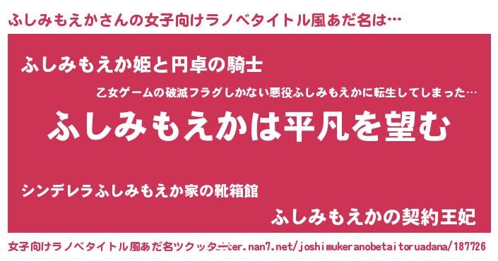 | 胡散臭い通販商品みたいなあだ名 | 『信頼と実績のサプリメント…その名も「ふしみもえか」』 |