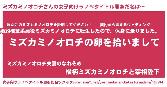 | 男性向けラノベタイトル風あだ名 | 『ミズカミノオロチの嫁は女の子じゃないと思った?』 |