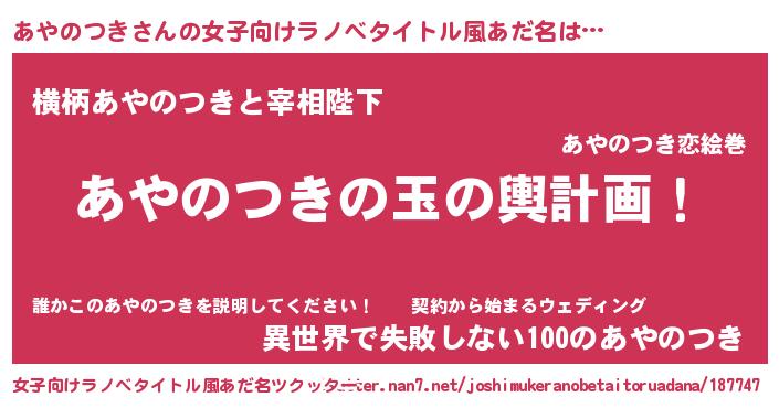 | 男性向けラノベタイトル風あだ名 | 『あやのつき~年齢イコール彼女いない歴の魔法使い~』 |