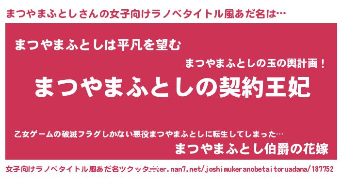 | 男性向けラノベタイトル風あだ名 | 『まつやまふとしという概念が存在しない退屈な世界 』 |