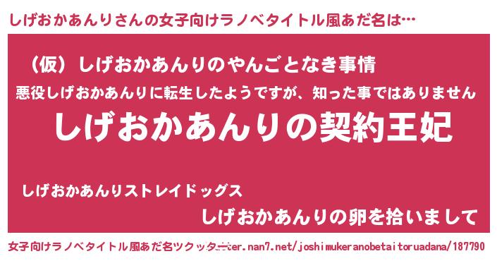| 胡散臭い通販商品みたいなあだ名 | 『来世でも幸せになれる水素水…その名も「しげおかあんり」』 |