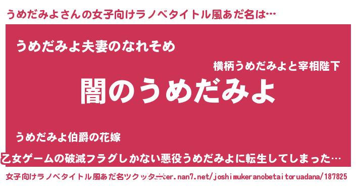 | 男性向けラノベタイトル風あだ名 | 『Re:うめだみよから始める異世界生活』 |