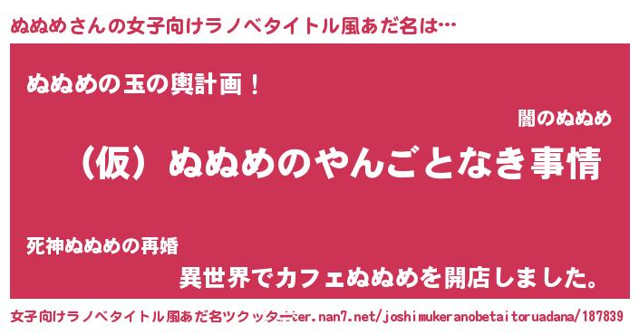 | 男性向けラノベタイトル風あだ名 | 『ぬぬめの憂鬱』 |