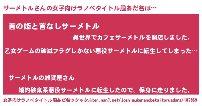 | 男性向けラノベタイトル風あだ名 | 『魔弾の王とサーメトル』 |