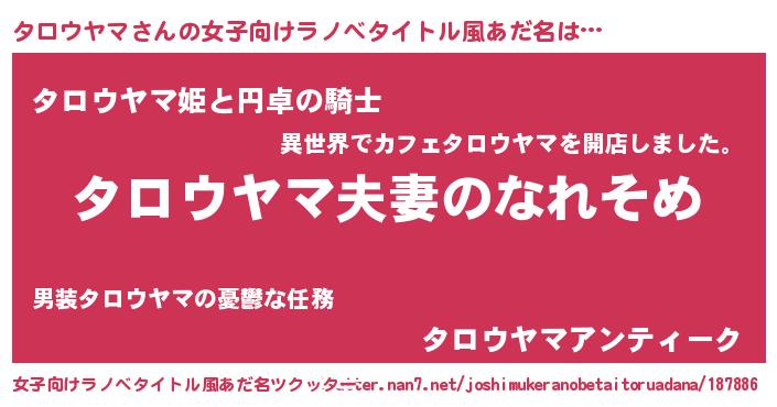 | 男性向けラノベタイトル風あだ名 | 『おまえをオタクにしてやるから、俺をタロウヤマにしてくれ! 』 |