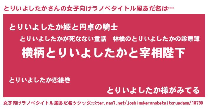 | 男性向けラノベタイトル風あだ名 | 『とりいよしたかに滅ぼされるだけの簡単なお仕事です』 |