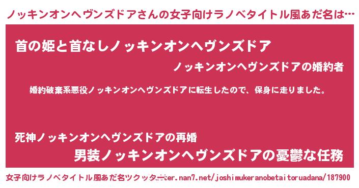 | 男性向けラノベタイトル風あだ名 | 『ノッキンオンヘヴンズドアスレイヤー』 |
