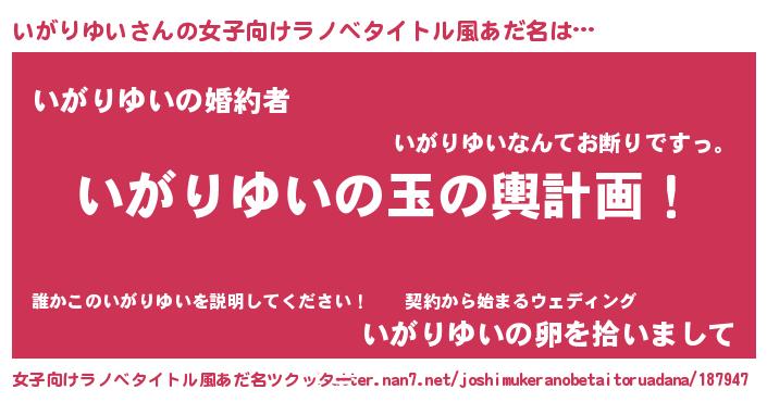 | 男性向けラノベタイトル風あだ名 | 『いがりゆい~年齢イコール彼女いない歴の魔法使い~』 |