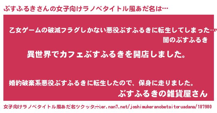 | 男性向けラノベタイトル風あだ名 | 『誰もが恐れるあのぶすふるきが、ぼくの専属メイドになるようです。』 |