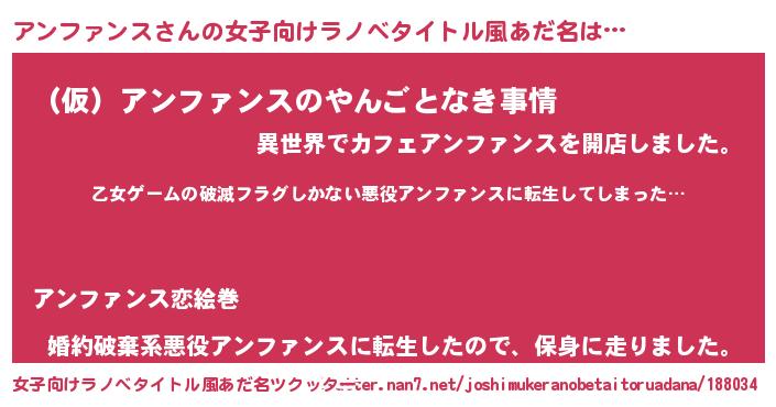 | 男性向けラノベタイトル風あだ名 | 『この素晴らしい世界にアンファンスを!』 |