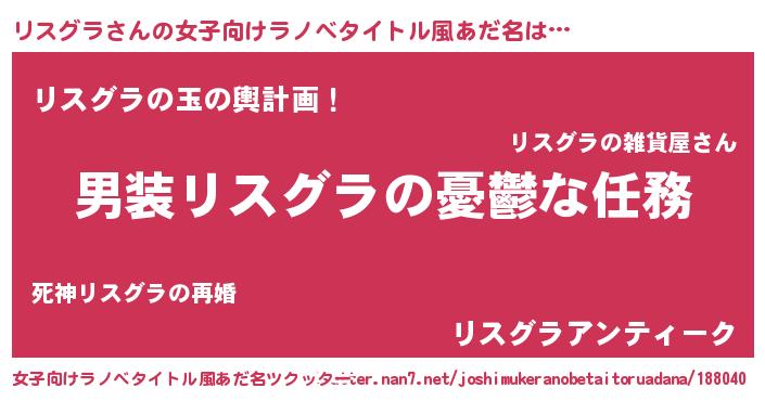 リスグラさんの女子向けラノベタイトル風あだ名は… 『男装リスグラの憂鬱な任務』『リスグラの玉の輿計画!』『リスグラアンティーク』 ツクッター #女子向けラノベタイトル風あだ名ツクッター http://tkutter.nan7.net/joshimukeranobetaitoruadana/188040/