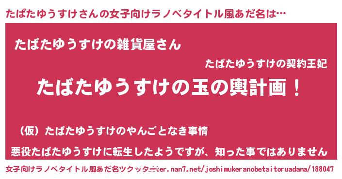 | 男性向けラノベタイトル風あだ名 | 『たばたゆうすけ~年齢イコール彼女いない歴の魔法使い~』 |