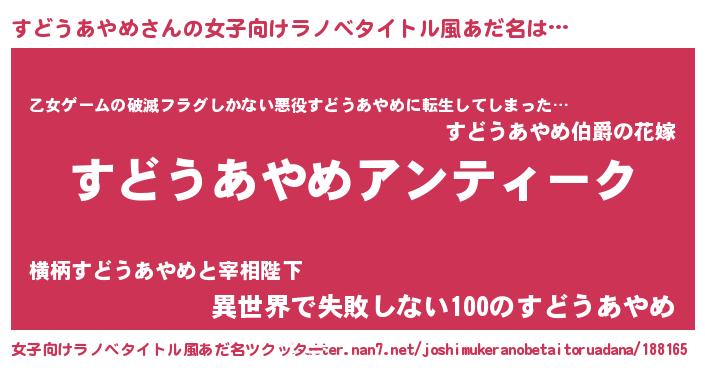 すどうあやめさんの女子向けラノベタイトル風あだ名は… 『すどうあやめアンティーク』『乙女ゲームの破滅フラグしかない悪役すどうあやめに転生してしまった…』『異世界で失敗しない100のすどうあやめ』 ツクッター #女子向けラノベタイトル風あだ名ツクッター http://tkutter.nan7.net/joshimukeranobetaitoruadana/188165/