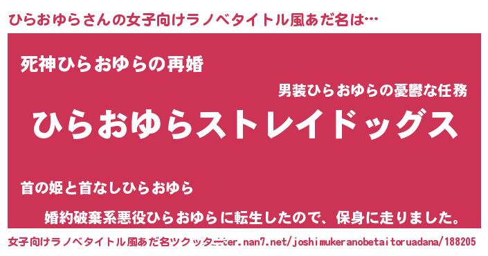 | 男性向けラノベタイトル風あだ名 | 『Re:ひらおゆらから始める異世界生活』 |