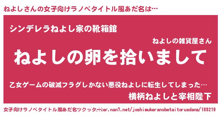 ねよしさんの女子向けラノベタイトル風あだ名は… 『ねよしの卵を拾いまして』『シンデレラねよし家の靴箱館』『横柄ねよしと宰相陛下』 ツクッター #女子向けラノベタイトル風あだ名ツクッター http://tkutter.nan7.net/joshimukeranobetaitoruadana/188219/