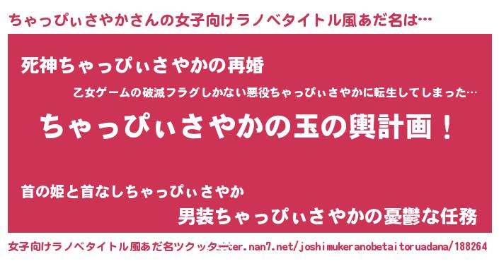 | 男性向けラノベタイトル風あだ名 | 『ちゃっぴぃさやか~年齢イコール彼女いない歴の魔法使い~』 |
