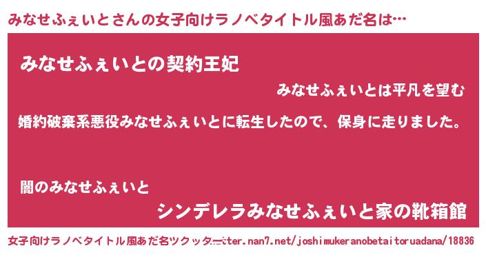 | 胡散臭い通販商品みたいなあだ名 | 『来世でも幸せになれる招き猫…その名も「みなせふぇいと」』 |