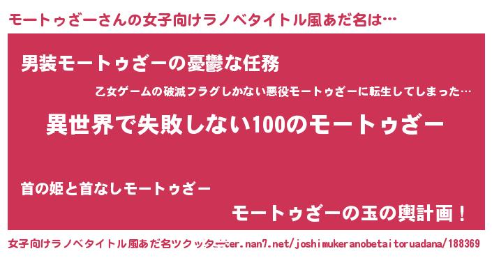 | 男性向けラノベタイトル風あだ名 | 『モートゥざーという概念が存在しない退屈な世界 』 |