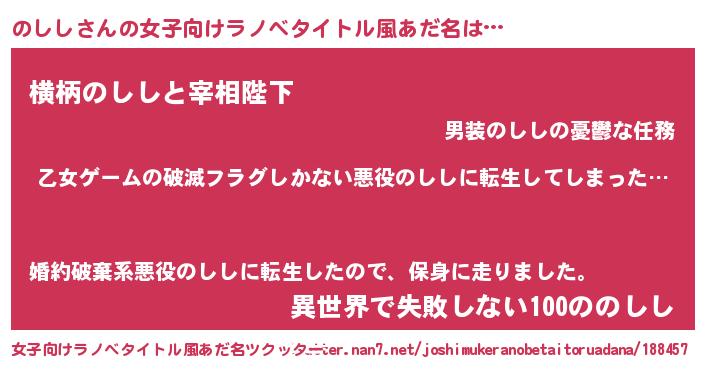 | 男性向けラノベタイトル風あだ名 | 『この素晴らしい世界にのししを!』 |