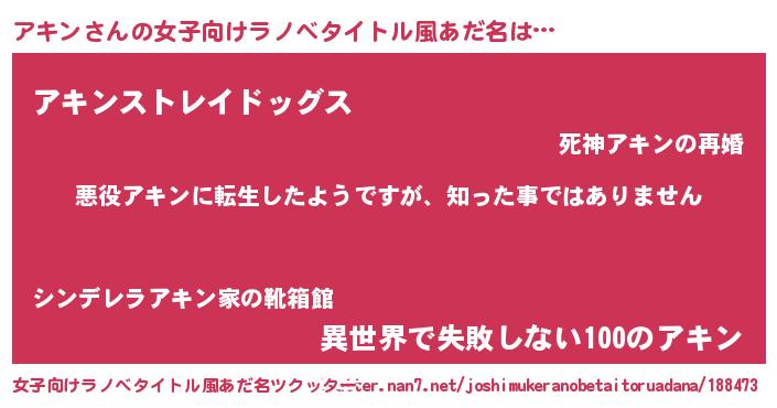 | 男性向けラノベタイトル風あだ名 | 『この素晴らしい世界にアキンを!』 |