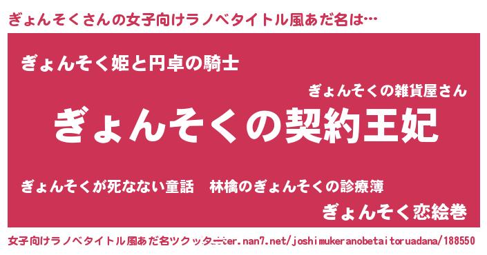 | 男性向けラノベタイトル風あだ名 | 『ぎょんそくという概念が存在しない退屈な世界 』 |