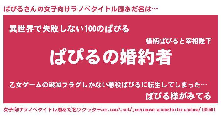 ぱぴるさんの女子向けラノベタイトル風あだ名は… 『ぱぴるの婚約者』『異世界で失敗しない100のぱぴる』『ぱぴる様がみてる』 ツクッター #女子向けラノベタイトル風あだ名ツクッター http://tkutter.nan7.net/joshimukeranobetaitoruadana/188601/