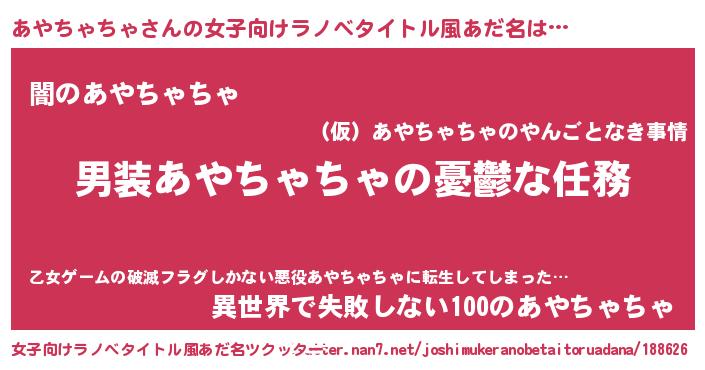| 男性向けラノベタイトル風あだ名 | 『うちのあやちゃちゃが世界を掌握している!』 |