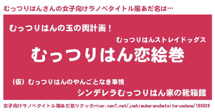 | 男性向けラノベタイトル風あだ名 | 『おまえをオタクにしてやるから、俺をむっつりはんにしてくれ! 』 |