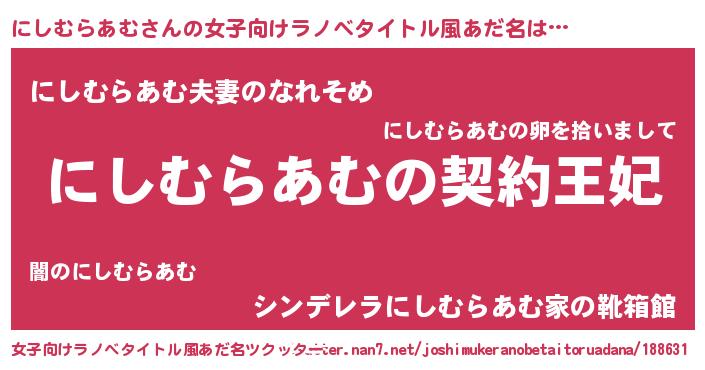 | 男性向けラノベタイトル風あだ名 | 『誰もが恐れるあのにしむらあむが、ぼくの専属メイドになるようです。』 |