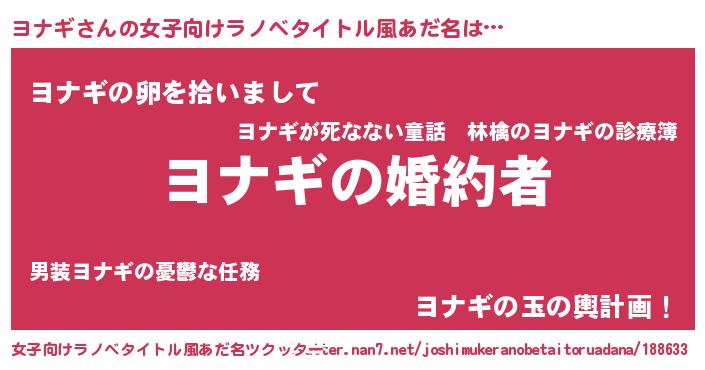 ヨナギさんの女子向けラノベタイトル風あだ名は… 『ヨナギの婚約者』『ヨナギの卵を拾いまして』『ヨナギの玉の輿計画!』 ツクッター #女子向けラノベタイトル風あだ名ツクッター http://tkutter.nan7.net/joshimukeranobetaitoruadana/188633/