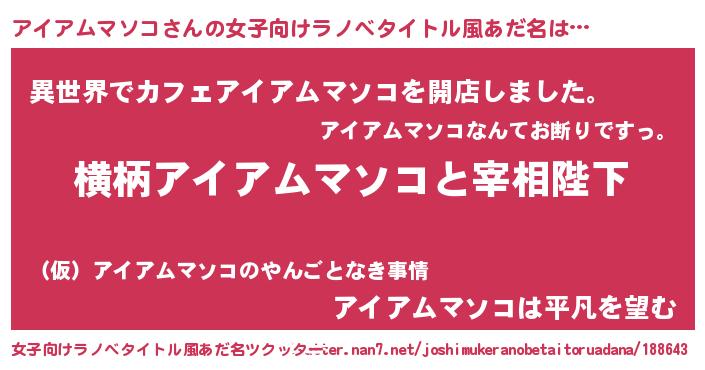 | 男性向けラノベタイトル風あだ名 | 『アイアムマソコに滅ぼされるだけの簡単なお仕事です』 |