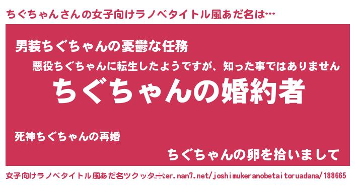 | 男性向けラノベタイトル風あだ名 | 『うちの娘の為ならば、俺はもしかしたらちぐちゃんも倒せるかもしれない。』 |